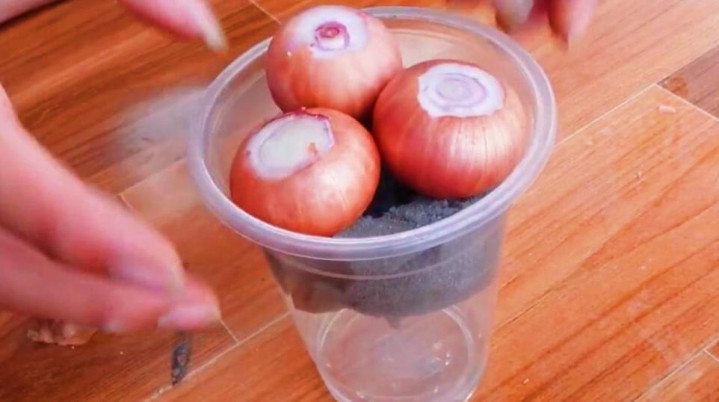 先在吸水棉上放几颗处理好的葱头,一个杯子放三颗都行,甚至更多。
