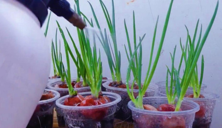 等葱头长出根须后,就可以开始“喂”水肥了。